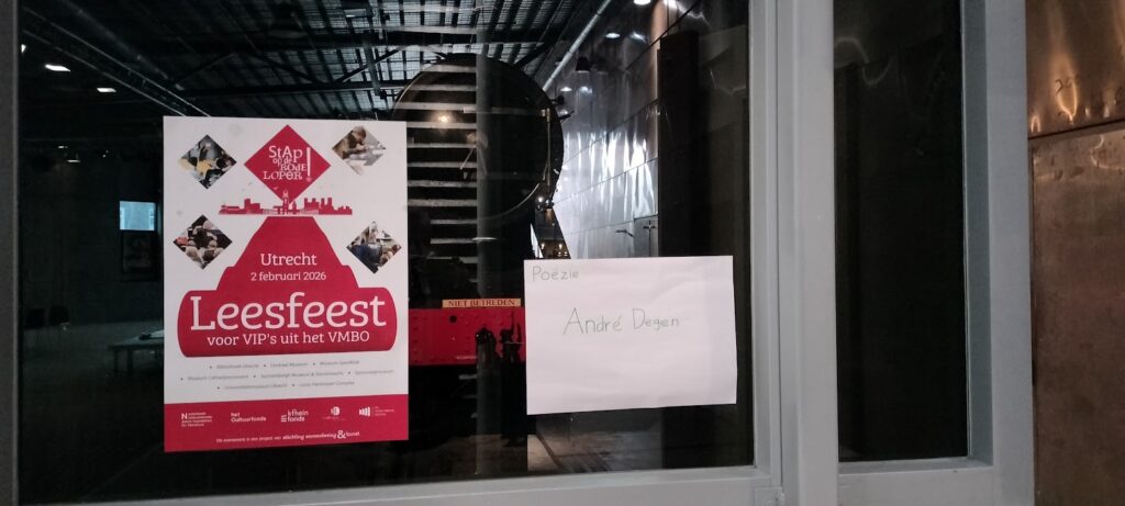 Afgelopen maandag (2 februari 2026) mocht ik ‘reserveheld’ zijn voor Stap op de Rode Loper!, het project waarbij, door het hele land, literair-culturele dagen voor vmbo’ers uit de bovenbouw worden georganiseerd. Ik mocht opdraven voor de editie in Utrecht. Dat betekende dat ik stand-by stond als poëzieworkshopdocent en pas in actie hoefde te komen, als er iemand uitviel c.q. niet op kwam dagen. In principe hoefde ik dus geen workshops te geven.